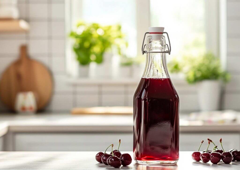 Return the strained cherry juice to the pan and let it simmer gently for about 10 minutes to thicken the syrup slightly. Add the lemon juice at this point if you want a more tangy touch. - Let it cool