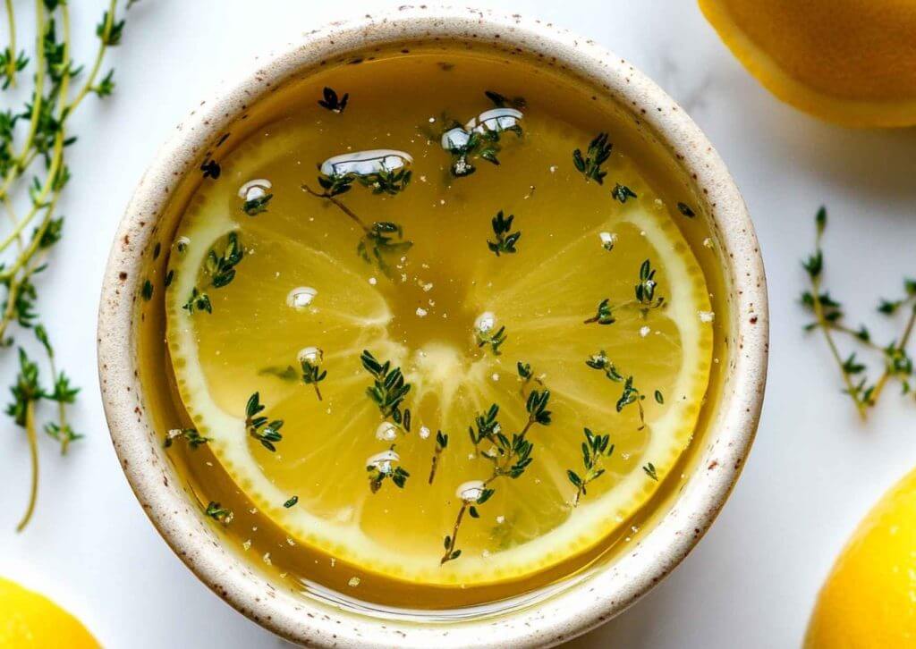 en una cacerola pequeña, mezcla agua y azúcar. Caliente a fuego medio, revolviendo hasta que el azúcar esté completamente disuelto. - Añade el tomillo y el limón.